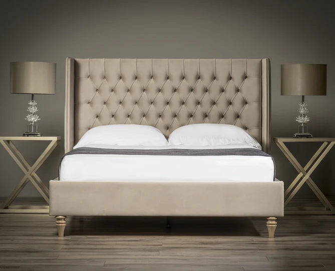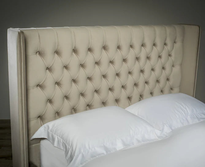 The Liberty Winged Upholstered Bed is designed for comfort and timeless style. This elegant bed features piped winged sides, a tall padded headboard (48" height), and a fully upholstered frame in soft, premium fabric.