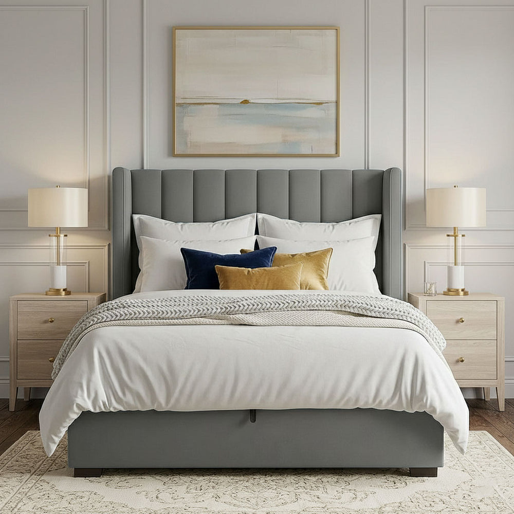 Experience the perfect harmony of refined design and modern convenience with the Signature Upholstered Ottoman Bed. Defined by its tall, fluted headboard and graceful winged sides, this stunning bed frame combines hotel-style sophistication with smart hidden storage — making it the ideal choice for a beautifully organised and stylish bedroom retreat.